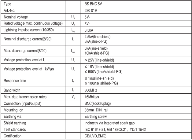 For protecting coaxial cable transmission devices from interruption caused by surge voltage, surge protective device uses BNC connection, provide reliable protection for coaxial cable transmission devices or video signal transmission devices from surge, operating over voltage and electrostatic discharging. Designed according to GB 18802.21 / IEC 61643-21.