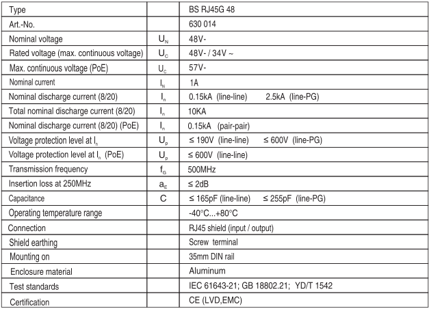 According to the concept of lightning protection zone, this surge protective device is installed at LPZ 0B -2 or higher interface or directly installed in the front near the equipment; according to IEC standard for CAT 6 or Class E integrated wiring system; all the industrial Ethernet 10M, 100M, 1GBit or higher network surge protection; nominal current, continuous DC high voltage, to support the POE network with power supply system.