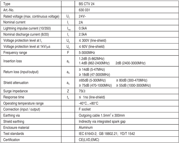 Surge protection for 75Ω satellite and TV cable system suitable for the common TV and satellite applications. Designed according to GB 18802.21/IEC 61643-21.
