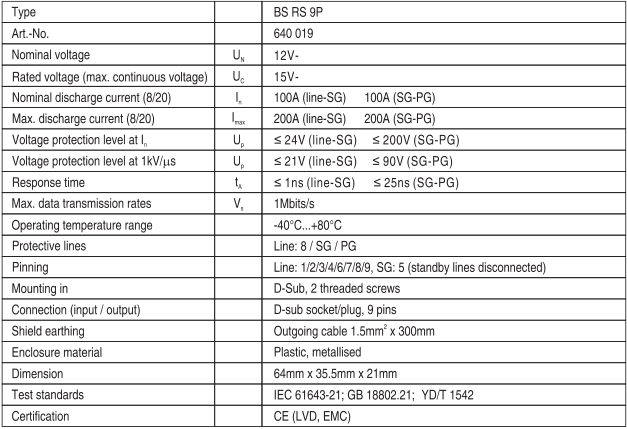 For using at LPZ 1-2 or higher. The series of BS...P provide surge protection for RS 485, RS 422 or RS 232 signal devices from damage, such as surge voltage, operating over voltage, electrostatic discharging and so on.