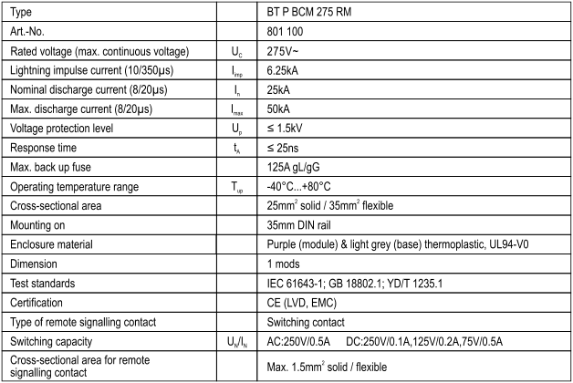 For installation at LPZ 0A -2 or higher, protecting low voltage devices from surge damages. Applied in SPD Class I+II (Class B+C) for various power supply system of lightning current surge protection. Designed according to IEC 61643-1/GB 18802.1.